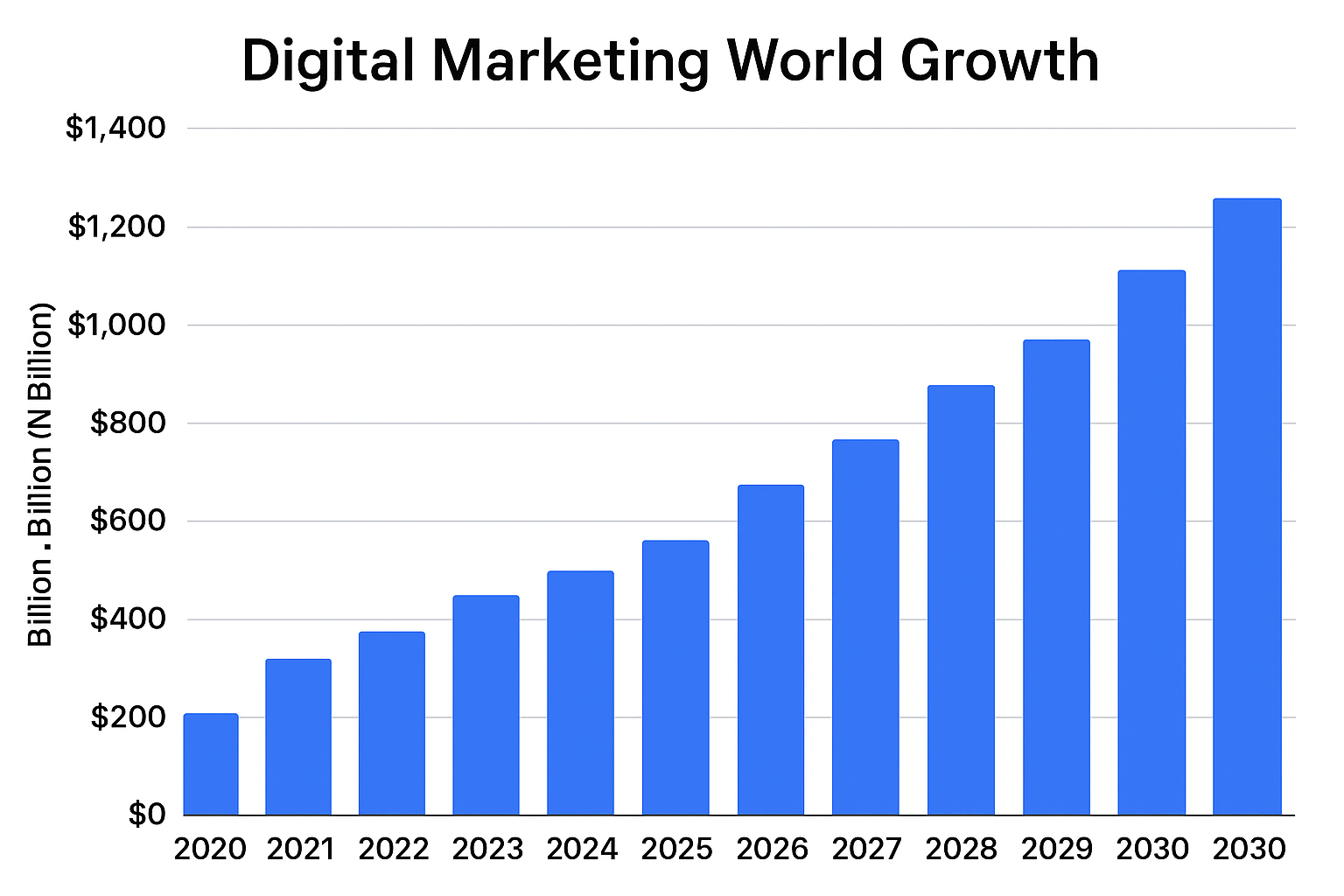Digital marketing has grown tremendously in the past decade, transforming how businesses reach and engage customers. Valued at $350 billion in 2020, the global market is projected to surpass $1.2 trillion by 2030, growing at a 13% annual rate. This rise is fueled by social media, AI-driven ads, influencer marketing, and mobile-first strategies. As consumers move online, digital marketing continues to dominate the business world, making it one of the fastest-growing industries globally